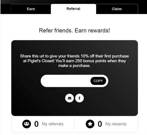 На вкладке реферала вы увидите свой пользовательский реферальный URL. Скопируйте и поделитесь этим URL, чтобы дать своим друзьям 10% скидки на первую покупку в Closet's Piglet.