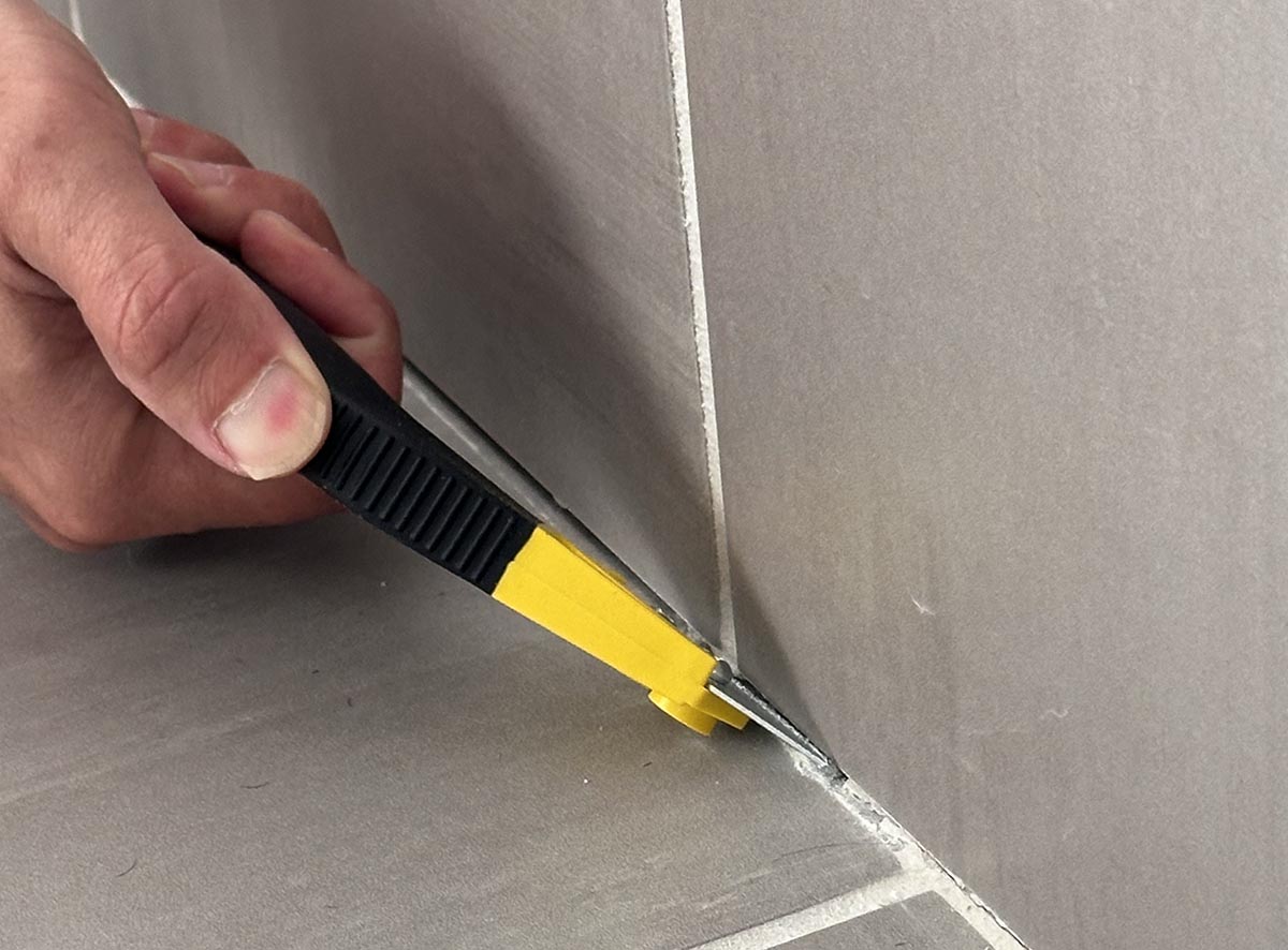 Удалите раствор между плитками, имея общий контроль и точность